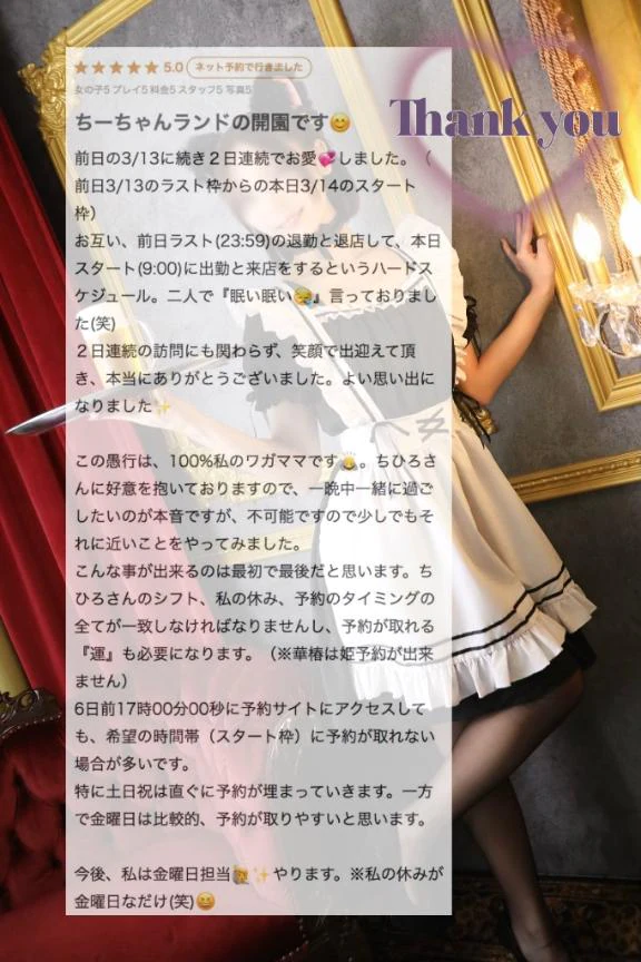 💌口コミありがとうございます 3/23 00:12 米澤ちひろ ちーちゃんランドの開園です😊 前日の3/13に続き2日連続でお愛💞しました。(前日3/13のラスト枠からの本日3/14のスタート枠) お互い、前日ラスト(23:59)の退勤と退店して、本日スタート(9:00)に出勤と来... 伊澤 とも(55)さんの口コミ 2026年3月14日訪問 伊澤とも様へ♡ 連続口コミありがとう❣️❣️ ラストからのスタートというハードスケジュールを頑張ってくれてありがとう🤍🥹 あれさっき会ったよね?感すごかったし全然現実です😌笑でも最初こそ『眠いね〜』って言ってたけどおかげさまでばっちり目が覚めました!👀✨ でもまさかこの二日間にそんな意図があったとは知らなかった!😳💓確かにタイミングってあるもんね…でもこれからは焦らず、会うたびにまた少しずつ仲良くなれるような関係が嬉しいなって思ってるよ✨Tくんもこれからお仕事大変になって会う時間がずれてきちゃうかもしれないけどタイミング合う時にゆっくり時間を紡いでいこ!🤍 米澤ちひろより🌾